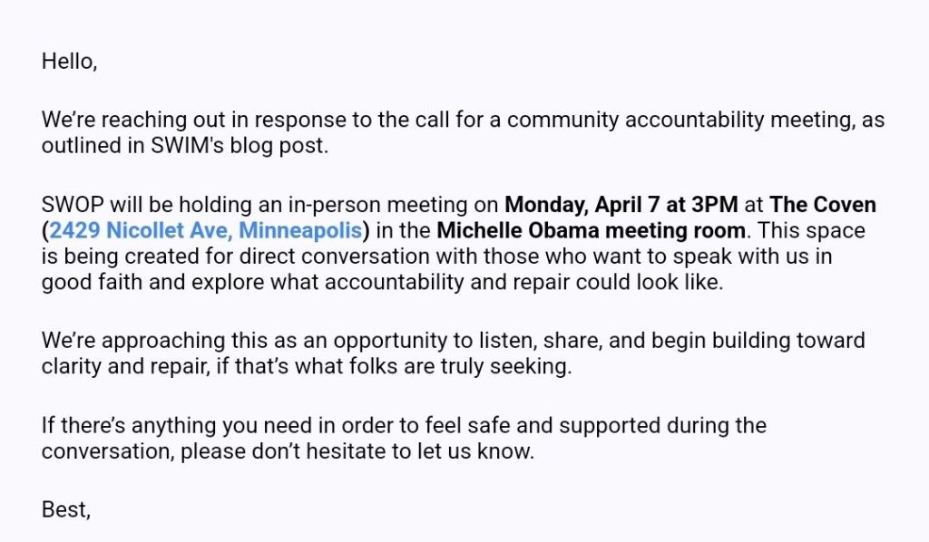 Of course we encourage you to join us in this conversation if you have the spoons, but there is no pressure to attend or provide a statement. Your experiences with this situation are still valid even if you choose to not engage with this process at this time.